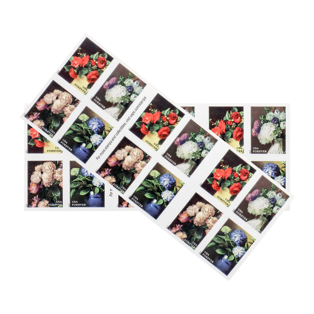 The 20-stamp sheet features four images inspired by 17th and 18th century still-life paintings of garden flowers: red camellias and yellow forsythia in a pitcher; white peonies and pink tree peonies in a vase; white hydrangeas, white and pink roses, green hypericum berries and purple lisianthus in a vase; and blue hydrangeas in a pot.